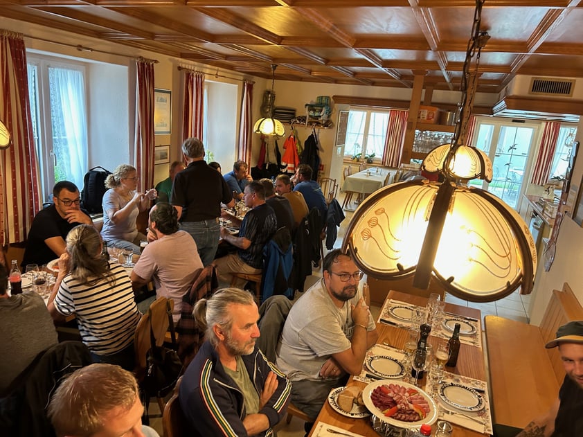 Wegen dem starken und anhaltenden Regen mussten wir das Outdoor-Apèro leider streichen und den Vortrag ins Restaurant Sennhaus verlegen. Durch das furchtbare Wetter und das Bergfeeling drängte sich ein Fondue im Sommer gerade so auf.